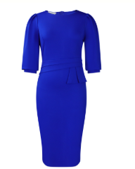 A sophisticated bodycon midi dress with a round neckline, puff half sleeves, and a ruched peplum waist detail that defines the figure beautifully while adding an elegant, feminine flourish. The sleek, body-skimming silhouette tapers smoothly to a knee-length hem, delivering a polished, confident look that flatters every figure. Smooth stretch fabric with a comfortable fit makes this a versatile piece that transitions effortlessly from work meetings to cocktail evenings, formal dinners, or special occasions. Style with pointed heels and minimal jewellery for a refined, complete look.