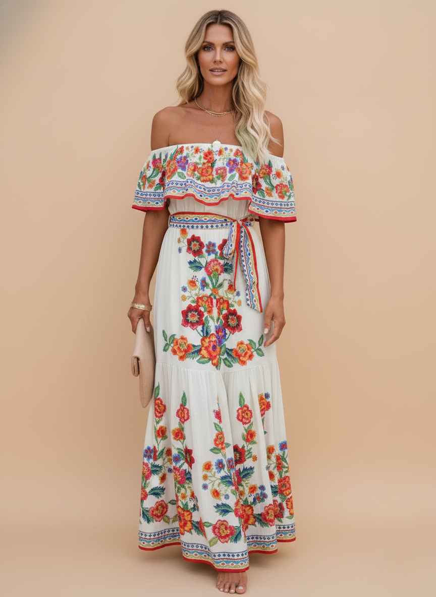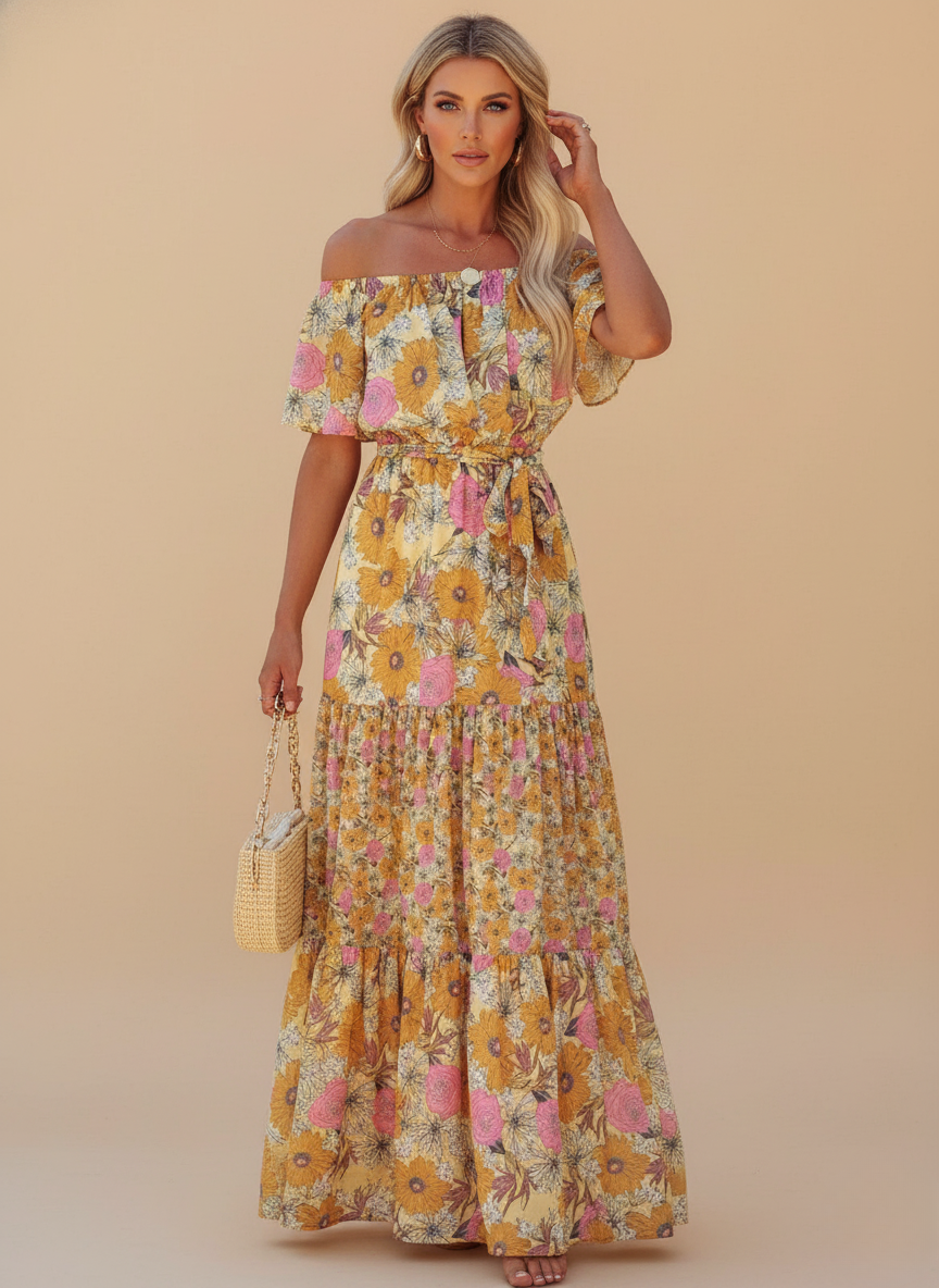 Floral Off Shoulder Tiered Boho Maxi Dress